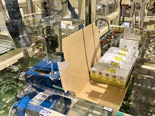 内容量チェックを終えた製品は6本パックに包装し自動製函機で箱詰めされ、賞味期限の捺印と本数確認のための重量検査を行います。