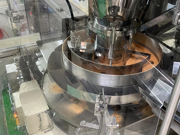 粉末のスープや具材を、ロールフィルムから製袋した1食分の袋(三方袋)に充填します。