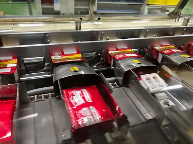 1食分の袋を3袋ずつ、自動製函機で製品の箱に詰めていきます。