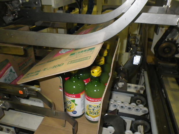 内容量チェックを終えた製品は6本パックに包装し自動製函機で箱詰めされ、賞味期限の捺印と本数確認のための重量検査を行います。