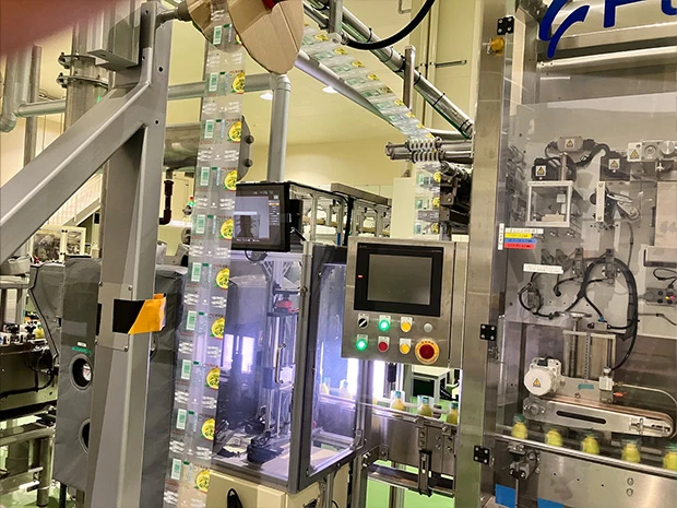 ラベルにライン上で賞味期限を捺印し、その後冷却された製品にラベルを貼ります。