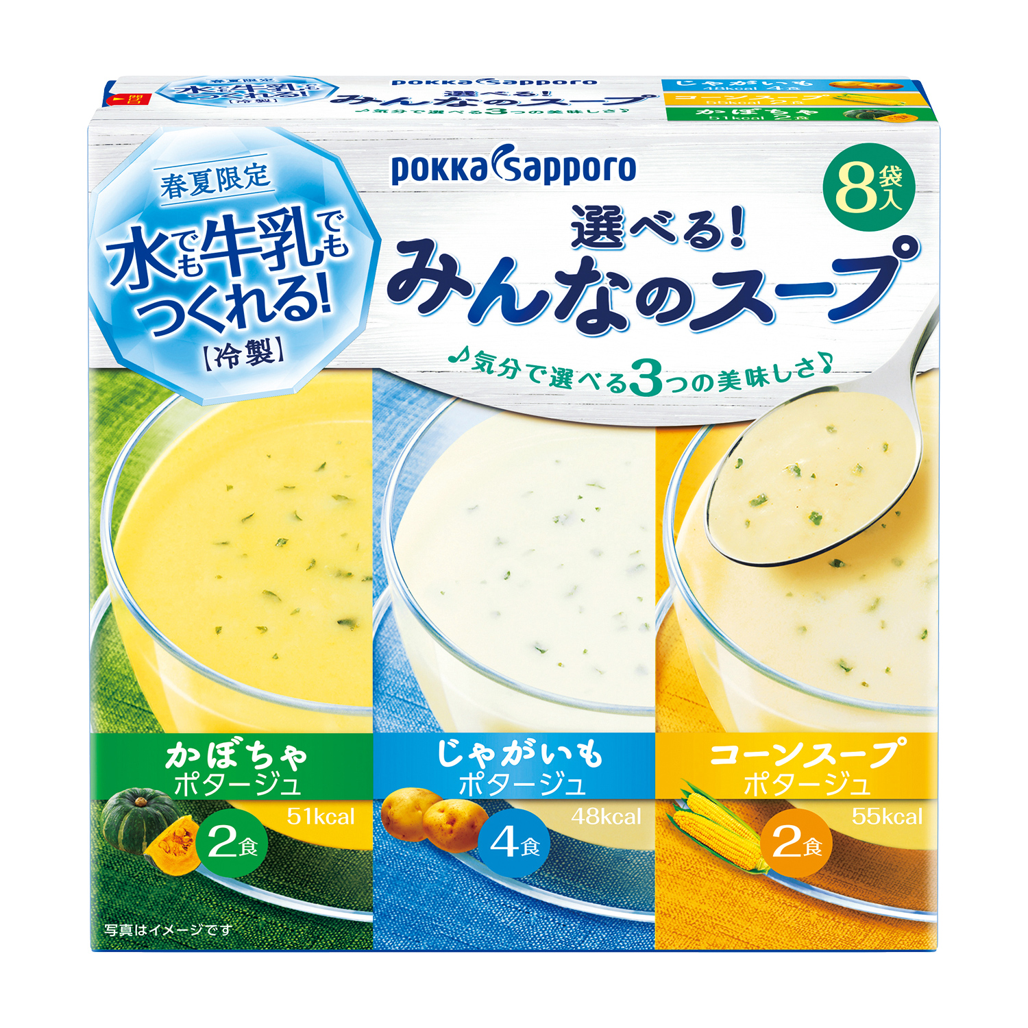 - 水でも牛乳でも作ることができる冷製スープのアソートタイプ。1箱で3種類の冷製スープが楽しめます。じゃがいも4食、コーン2食、かぼちゃ2食が入った8食セット。
