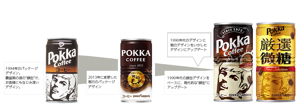 缶コーヒー「ポッカコーヒー」(1999年に「ポッカコーヒー オリジナル」と商品名を変更)は、1972年より当社の前身であるポッカコーポレーションから発売を開始しました。当時、コーヒーは喫茶店で飲むことが多かったため、喫茶店の本格的なコーヒーの味わいを目指し、さらには現在では一般的な190g缶コーヒーとして開発され、後の巨大な缶コーヒー市場のパイオニア的な存在として広まりました。今年で48年目を迎える缶コーヒー「ポッカコーヒー」は、“顔缶”の愛称で親しまれている男性の顔のイラストが描かれた缶パッケージ、コーヒー感と甘みのバランスのとれた味わいが楽しめるとして、長年多くのお客様にご愛飲いただいています。