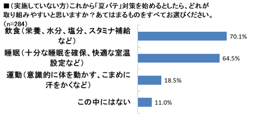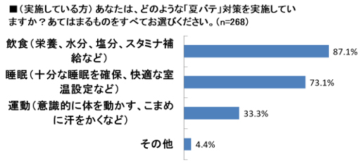 調査対象者全員に、夏バテ対策として実施していることやこれから取り組めそうな事を聞いたところ(複数回答可)、実施している方は「飲食(栄養、水分、塩分、スタミナ補給など)」87%「睡眠(十分な睡眠を確保、快適な室温設定など)」73%「運動(意識的に体を動かす、こまめに汗をかくなど)」33%「その他」4%、実施していない方は「飲食」70%「睡眠」65%「運動」19%「この中にはない」11%と答え、夏バテ対策として「飲食」を選ぶ方が多いことが分かりました。