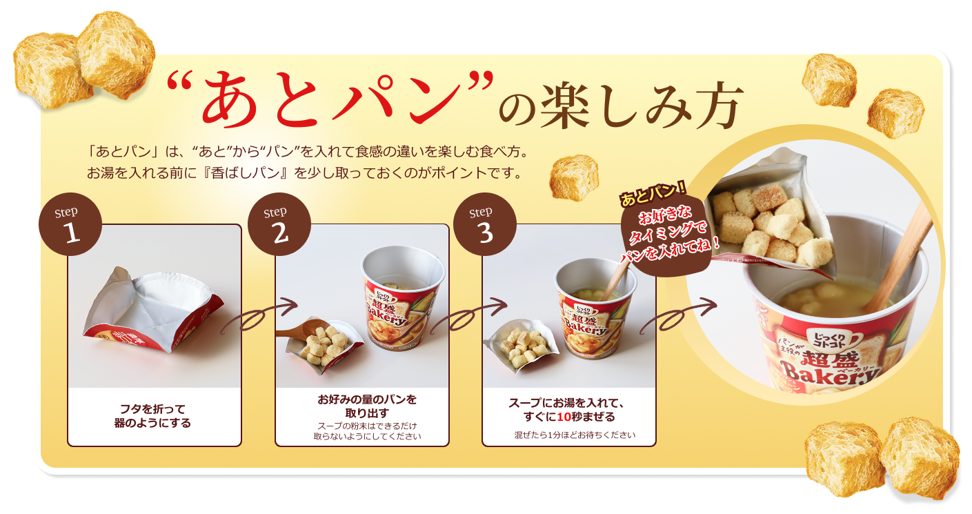 こんがりと焼き上げた超盛りだくさんの香ばしいパンに、じっくりと手間ひまかけて丁寧に作った濃厚なスープが絡む味わいで、ココロもお腹も満たすことのできる『濃厚スープ楽しむ食事パン』です。パンたっぷり2倍量※なので、しっかりとした食べごたえ。忙しい合間のランチにこれ1品でココロもお腹も満足できます。