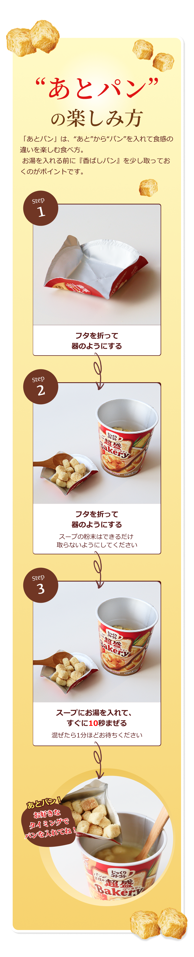 こんがりと焼き上げた超盛りだくさんの香ばしいパンに、じっくりと手間ひまかけて丁寧に作った濃厚なスープが絡む味わいで、ココロもお腹も満たすことのできる『濃厚スープ楽しむ食事パン』です。パンたっぷり2倍量※なので、しっかりとした食べごたえ。忙しい合間のランチにこれ1品でココロもお腹も満足できます。