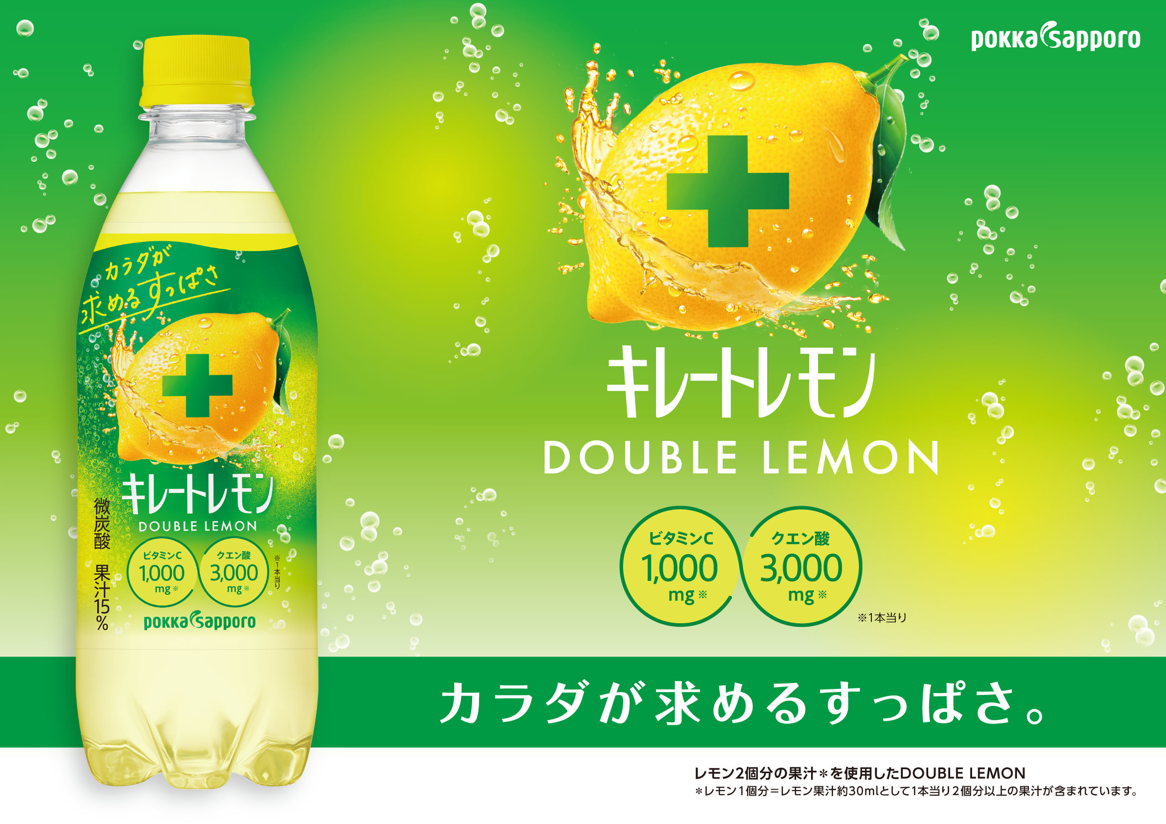 レモン2個分の果汁*と、ビタミンC1000mg、クエン酸3000mgが入った「レモン価値体感飲料」です。レモンのすっぱいおいしさを味わいながら、瞬間的にリフレッシュでき、モチベーションまで上がります。
