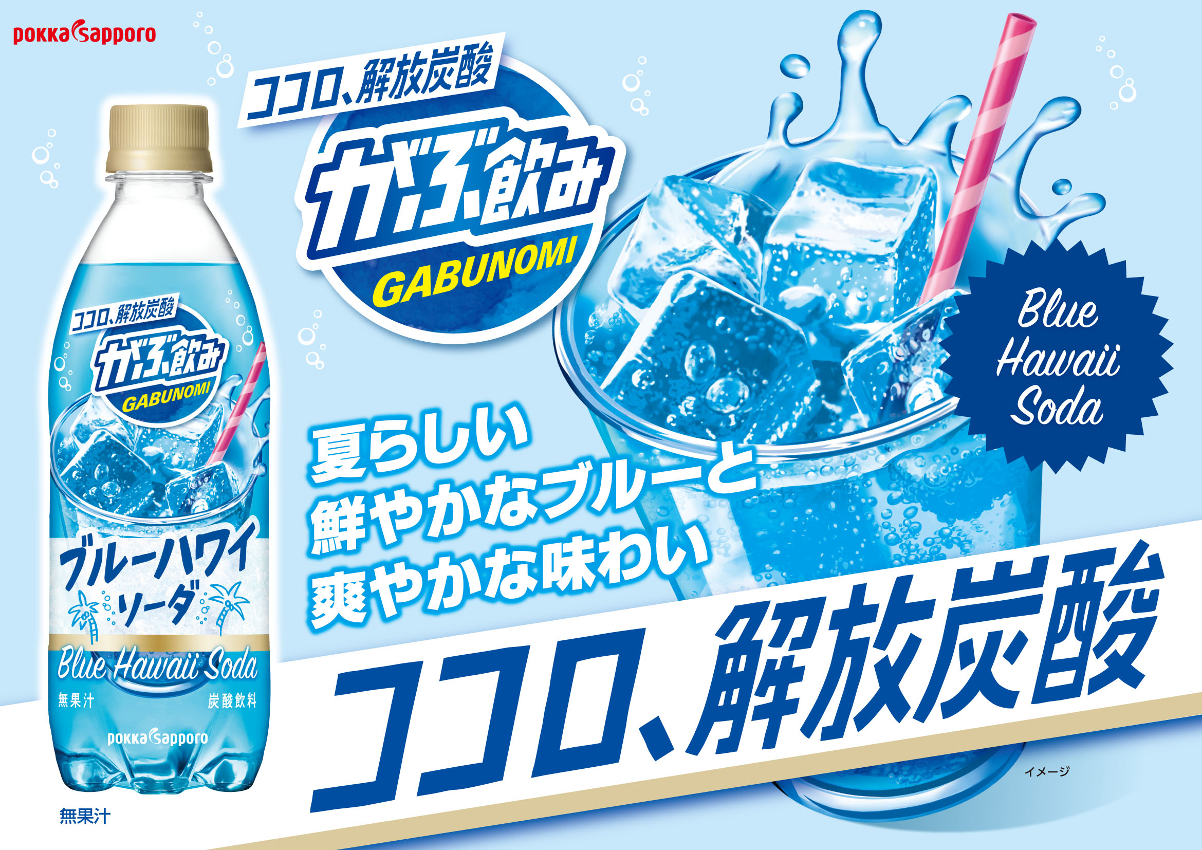 ブルーの鮮やかな液色と爽やかな味わいの「がぶがぶ飲めるブルーハワイソーダ」です。しゅわしゅわした炭酸で爽快感を想起させ、がぶ飲みらしい解放的な気分になることができます。