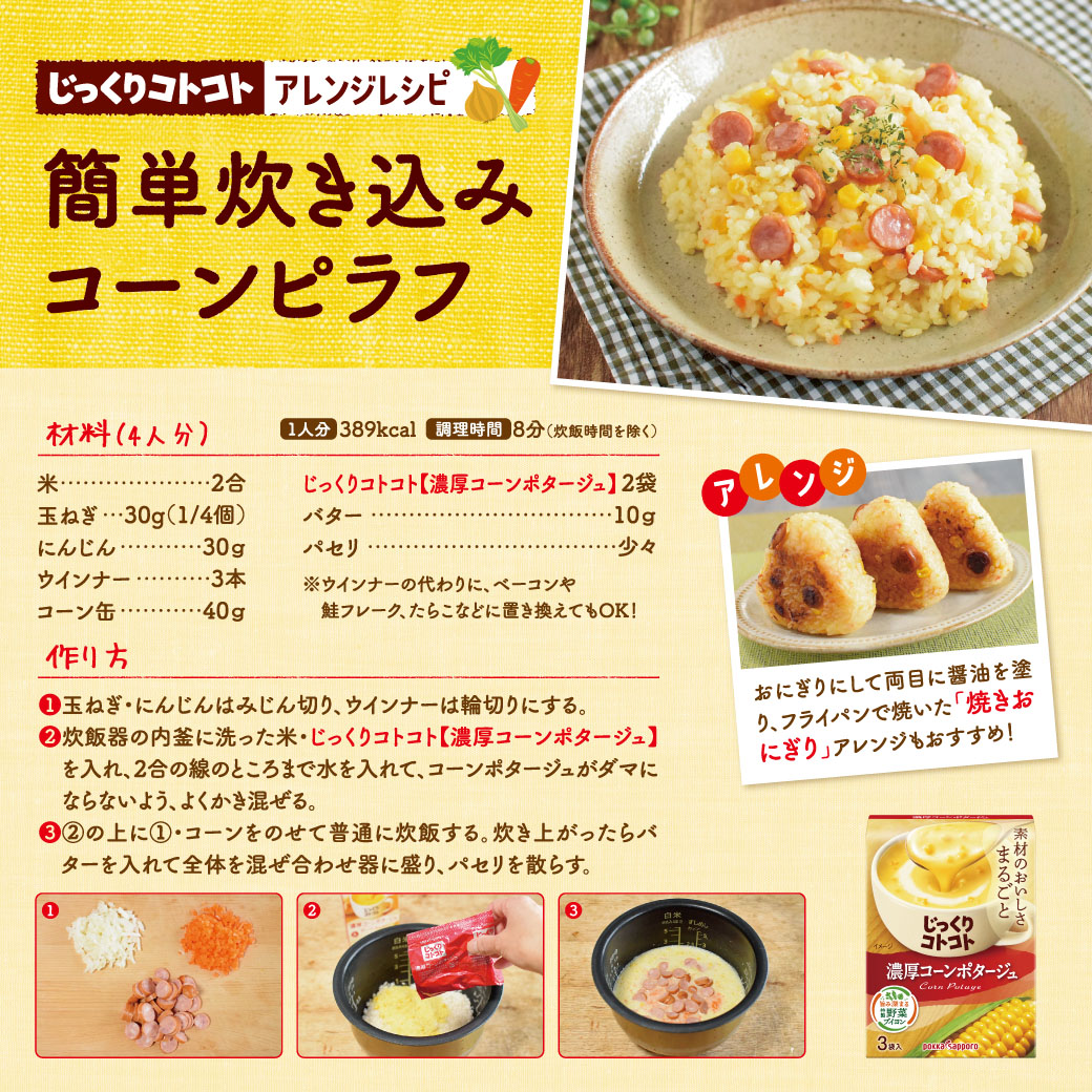 | 原材料 | スイートコーンパウダー(ニュージーランド製造)、ホエイパウダー、乳糖、クリーム加工品(植物油脂、クリーム、乳糖、乳たんぱく、その他)、砂糖、クリーミングパウダー、食塩、野菜ブイヨン、チキンブイヨン、うきみ(乾燥スイートコーン)/増粘剤(加工でん粉)、加工でん粉、調味料(アミノ酸等)、(一部に小麦・乳成分・大豆・鶏肉を含む) |