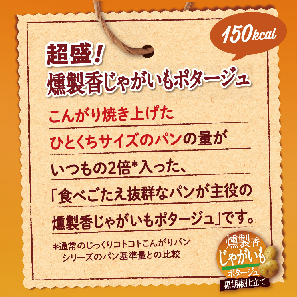こんがり焼き上げたひとくちサイズのパンの量がいつもの2倍*入って食べごたえ抜群!燻製香と黒胡椒で楽しむ「パンが主役の」ポタージュです。じっくりコトコトこんがりパン超盛シリーズはブランド史上最高パン量※なので主食にもおすすめです。
