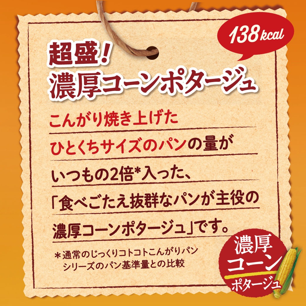 こんがり焼き上げたひとくちサイズのパンの量がいつもの2倍*入った、食べごたえ抜群なパンが主役の濃厚コーンポタージュ。じっくりコトコトこんがりパン超盛シリーズはブランド史上最高のパン量※なので主食としても楽しめます。