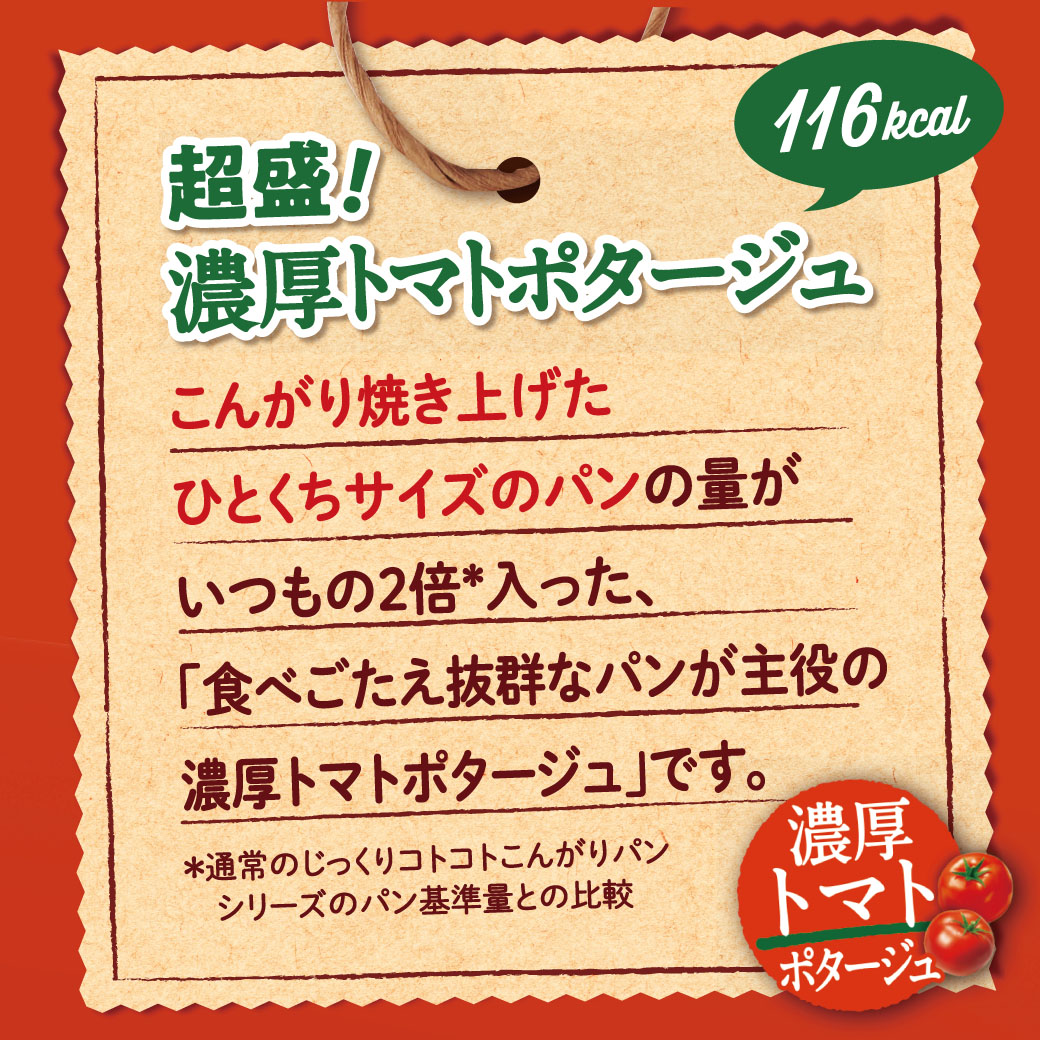 こんがり焼き上げたひとくちサイズのパンの量がいつもの2倍*入った、食べごたえ抜群なパンが主役の濃厚トマトポタージュ。じっくりコトコトこんがりパン超盛シリーズはブランド史上最高のパン量※なので主食としても楽しめます。