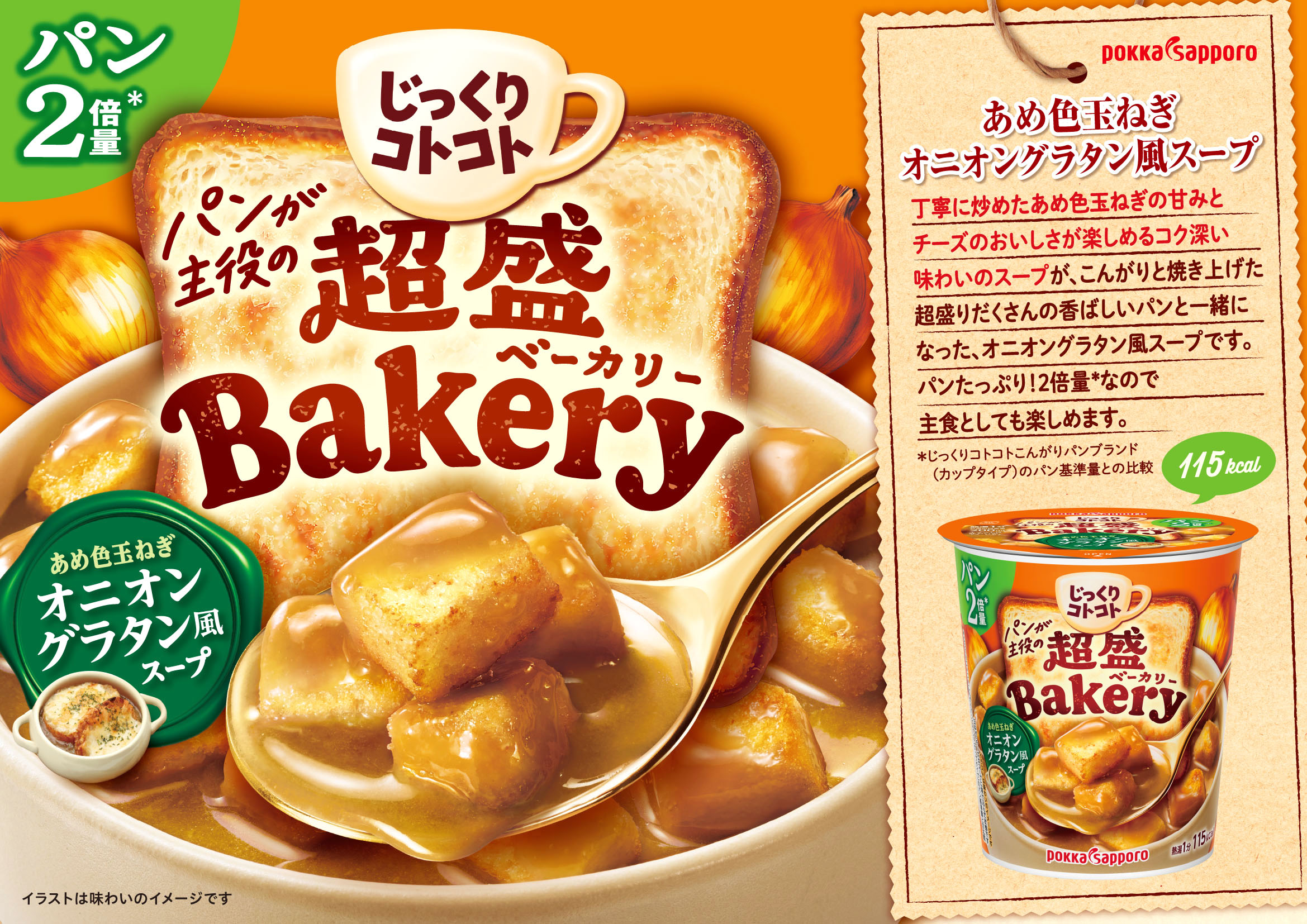 丁寧に炒めたあめ色玉ねぎの甘みとチーズのおいしさが楽しめるコク深い味わいのスープが、こんがりと焼き上げた超盛りだくさんの香ばしいパンと一緒になった、オニオングラタン風スープです。たっぷりのパン量なのでしっかりとした食べごたえがあり、ココロもお腹も満たすことができます。