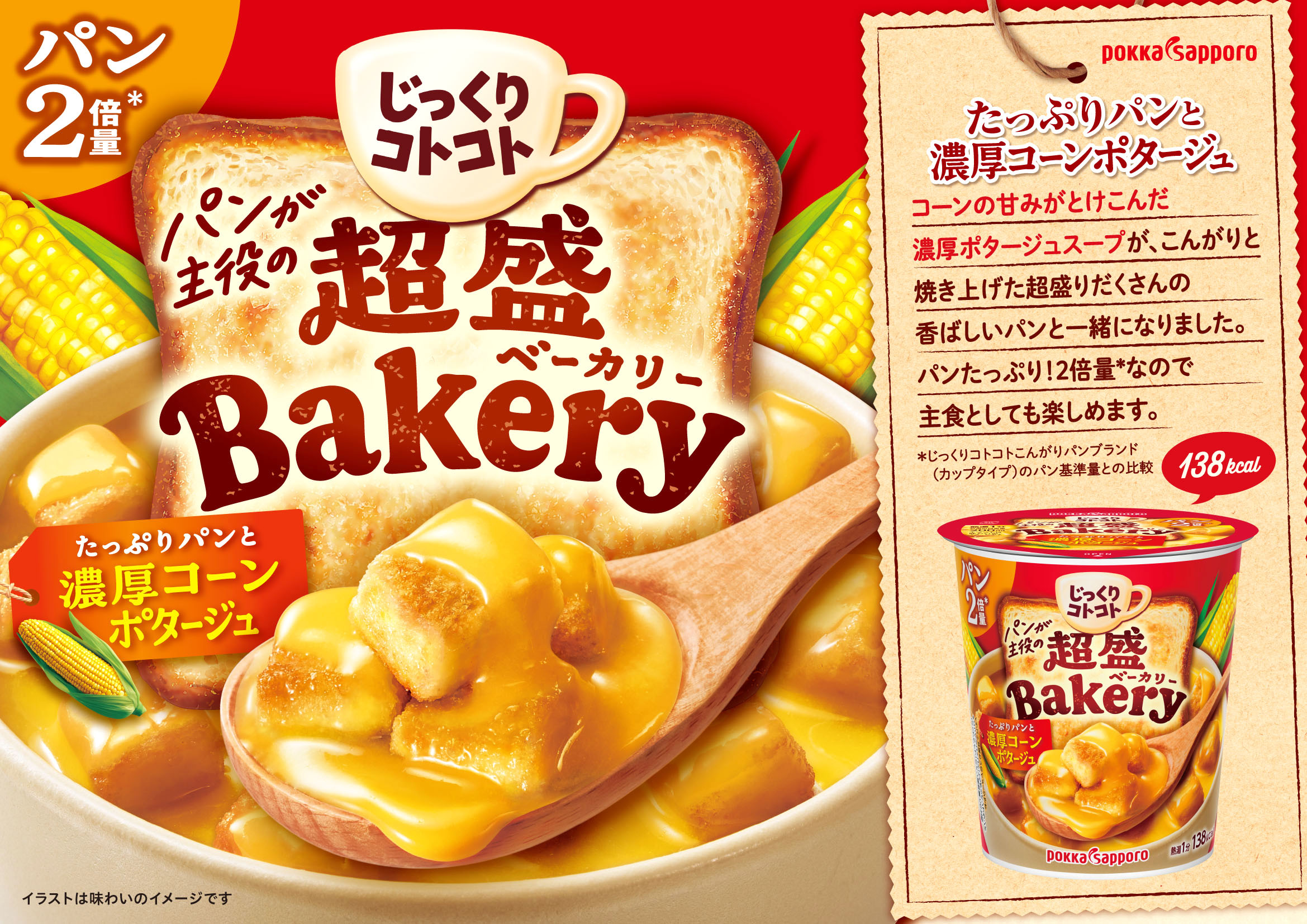 コーンの甘みがとけこんだ濃厚ポタージュスープが、こんがりと焼き上げた超盛りだくさんの香ばしいパンと一緒になりました。たっぷりのパン量なのでしっかりとした食べごたえがあり、ココロもお腹も満たすことができます。