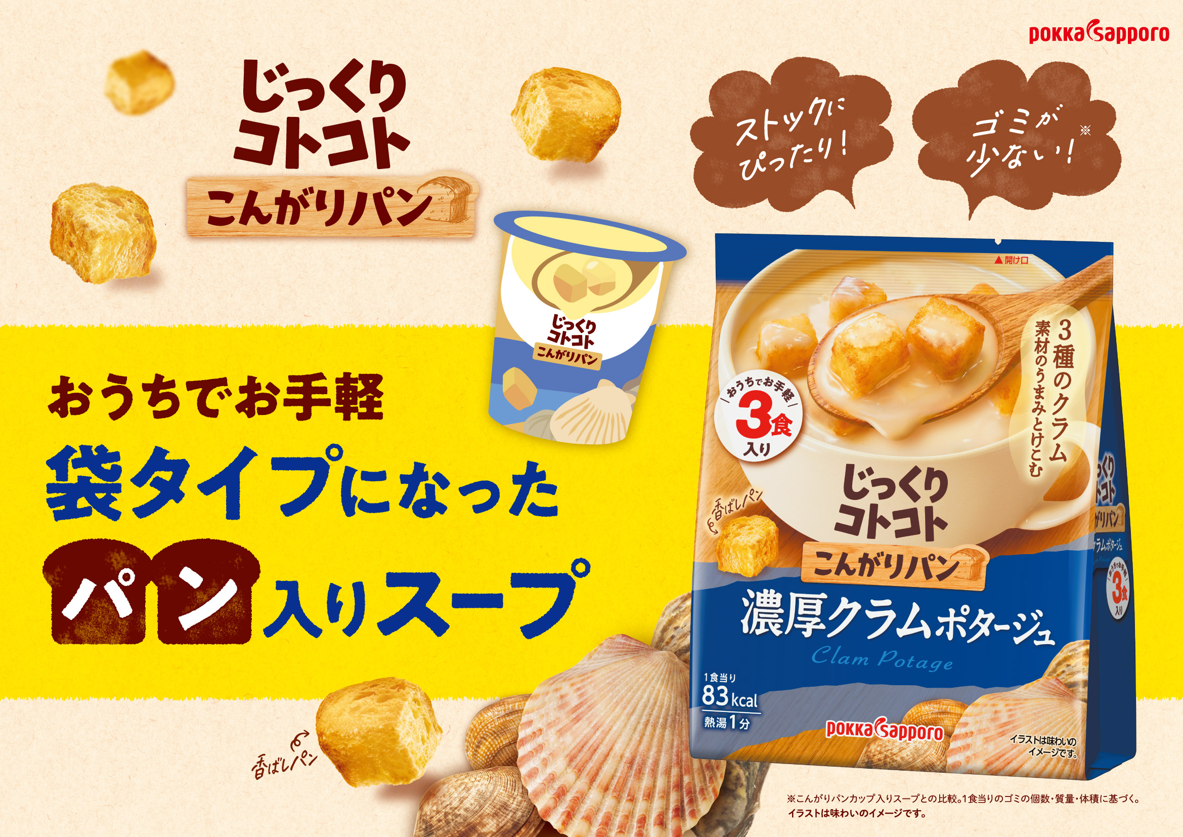 | 原材料 | 乾燥パン(国内製造)、ホエイパウダー、乳糖、クリーミングパウダー、じゃがいもパウダー、ホタテエキス(デキストリン、ホタテ煮汁、その他)、クリーム加工品、食塩、調味かきパウダー、野菜・フィッシュブイヨン、あさりエキス、チキンブイヨン、バター加工品、香辛料/増粘剤(加工でん粉、グァーガム)、調味料(アミノ酸等)、香料、(一部に小麦・乳成分・大豆・鶏肉を含む) |